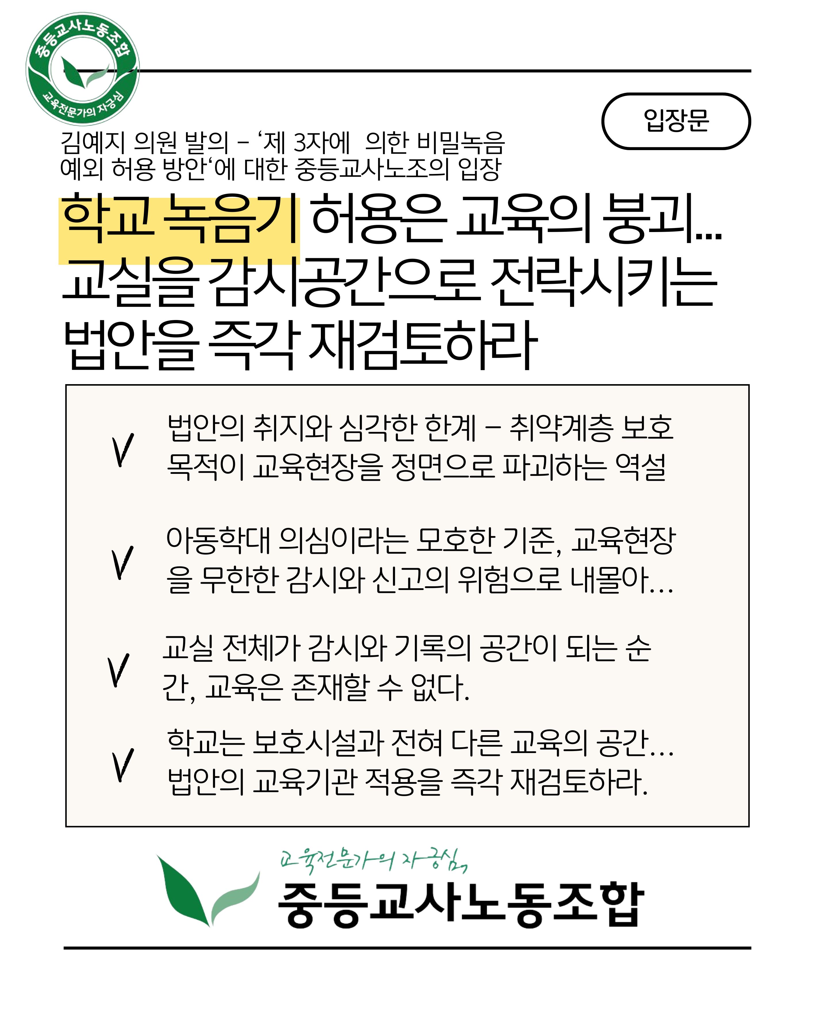 [입장문] 김예지 의원 발의 – ‘제3자에 의한 비밀녹음 예외 허용 법안’에 대한 중등교사노조의 입장